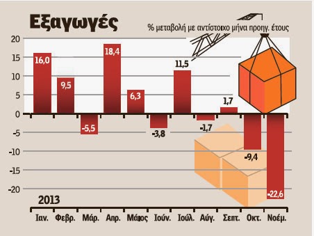 Ετσι, οι ρυθμοί αύξησης των εξαγωγών περιορίστηκαν στα επίπεδα του 1,2% την περίοδο Δεκεμβρίου 2012 - Νοεμβρίου 2013, σε σύγκριση με το δωδεκάμηνο Δεκεμβρίου 2011- Νοεμβρίου 2012.
